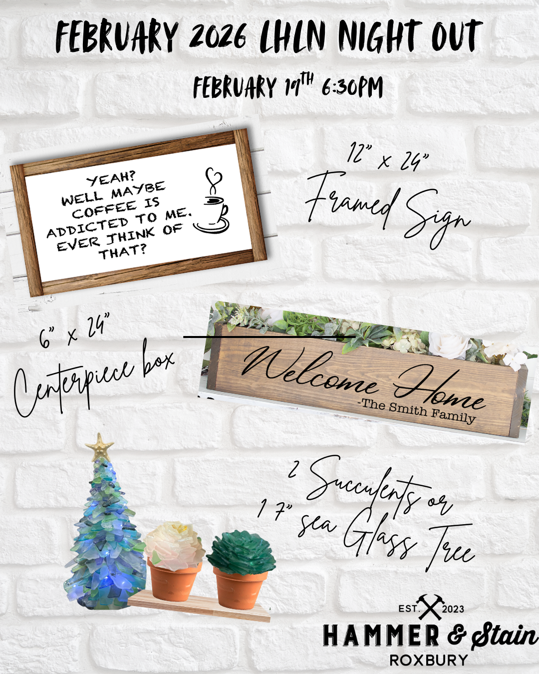 Spend an evening crafting with the Ladies of Lake Hopatcong on Thursday, February 19th at 6:30pm! Pick your perfect project from four festive options: a 12" x 24" Framed Sign, 6" x 24" Centerpiece Box, 7" Sea Glass Tree, or a pair of Sea Glass Succulents. All materials included—just bring yourself and get ready for a night of creativity and good company at Hammer & Stain Roxbury.